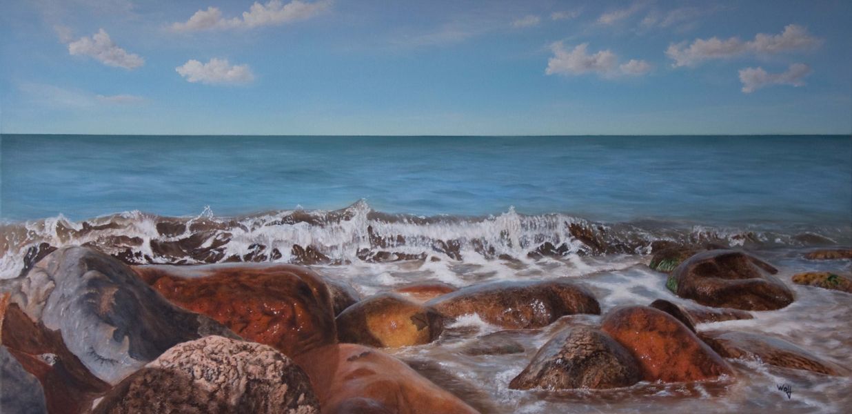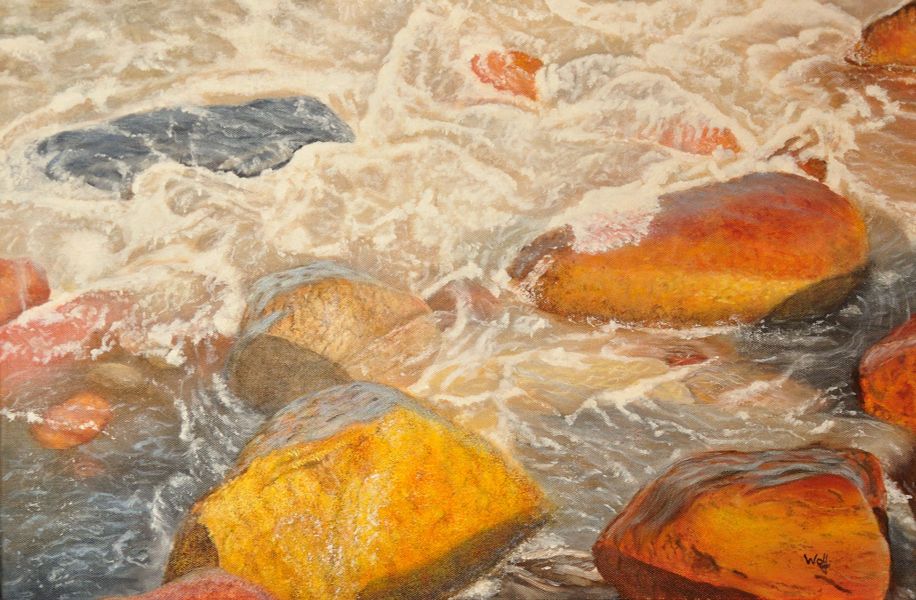 Nasse Steine im Wasser - mit Acrylfarben auf Leinwand war es eine Herausforderung :-). Ein 3 cm starker Keilrahmen in der Größe 140 x 70 cm als Malgrund.